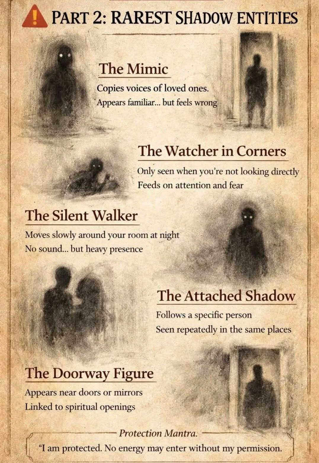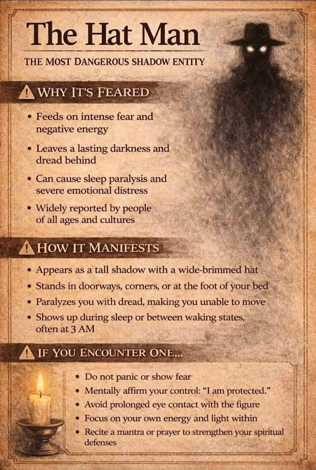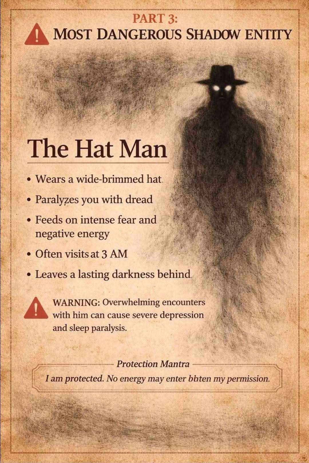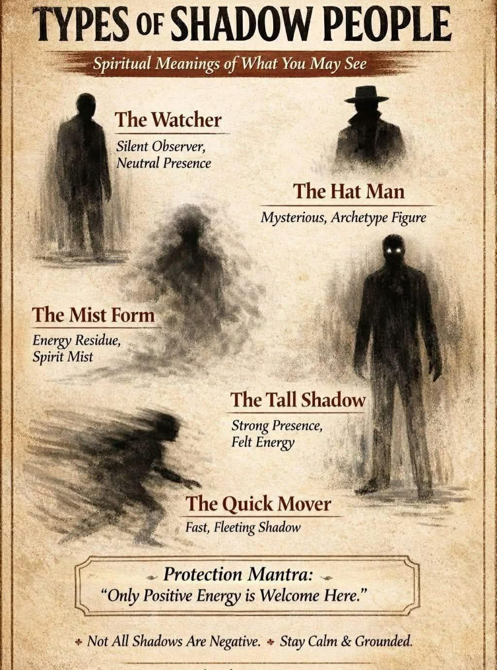 This is a type of haunting activity that has no real explanation. They are different from ghosts. They are usually shapeless dark masses. Mostly seen with your peripheral vision. They are known to do things that are different from ghosts. They can move between walls, they have no human features, they wear no clothes (except for the hat man/hooded figure shadow creatures). People who encounter them, have a feeling of dread. Clairvoyants that encounter Shadow People, say they do not feel they are human and consider them non-human. Shadow People have no discernible mouth, noses or facial expressions. Some are seen as child sized dark humanoids. Some people say they seem to be made up of dark smoke or dark steam. At times when they move, they appear to be moving on an invisible track from one place to another, such as a toy train on a small scale railroad track. They have been seen to hop or what appears to be a strange dance. They are known to stare at the floor.